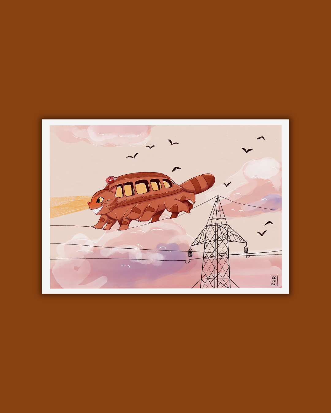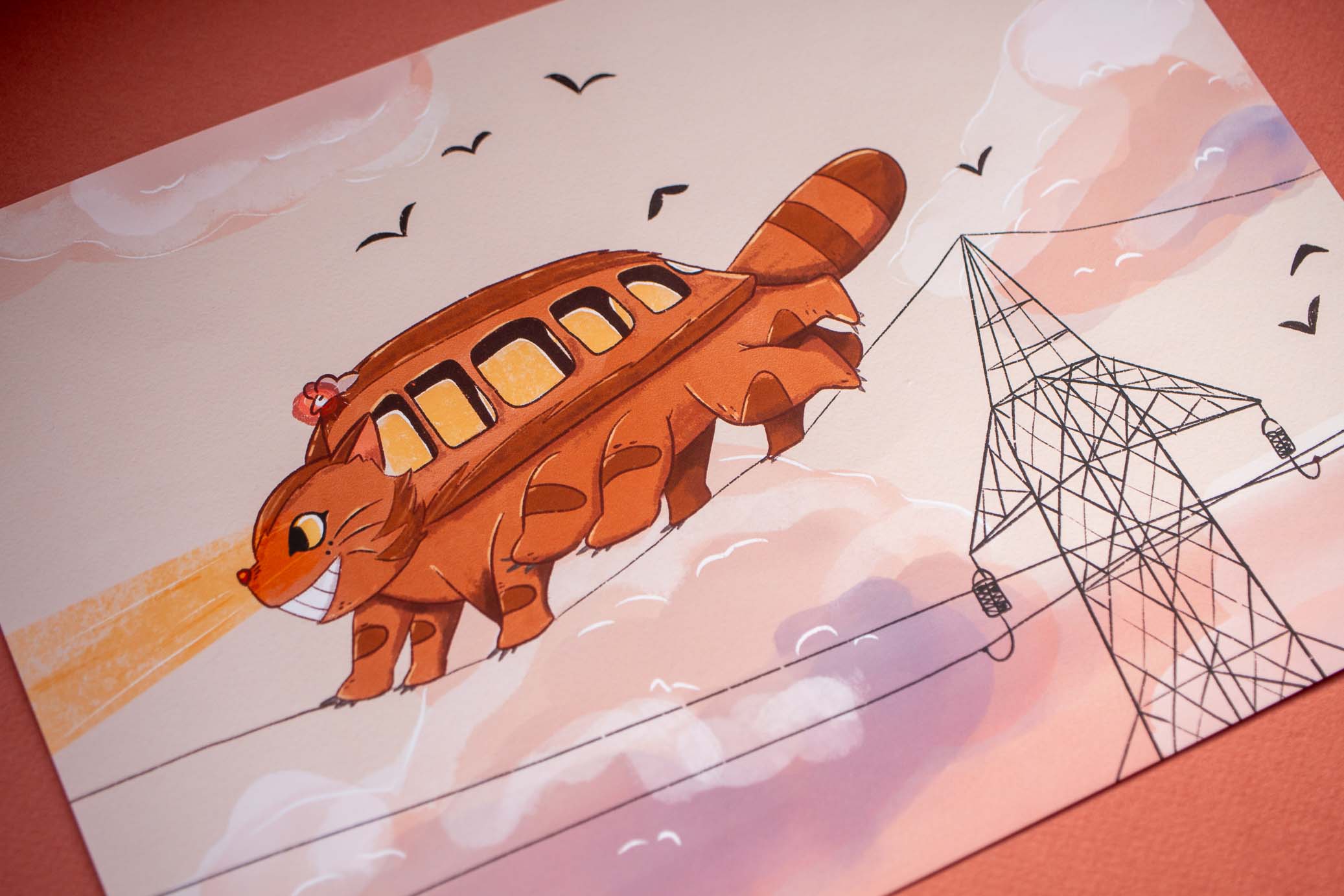 Elle représente le chat bus traversant le ciel rose sur un fil électrique.